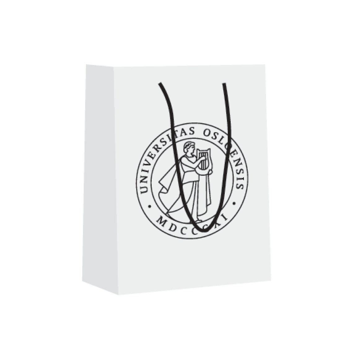 Pen gavepose i glanset, tykt papir, med UiO-logo på begge sider. 18 x 9 x 23 cm.