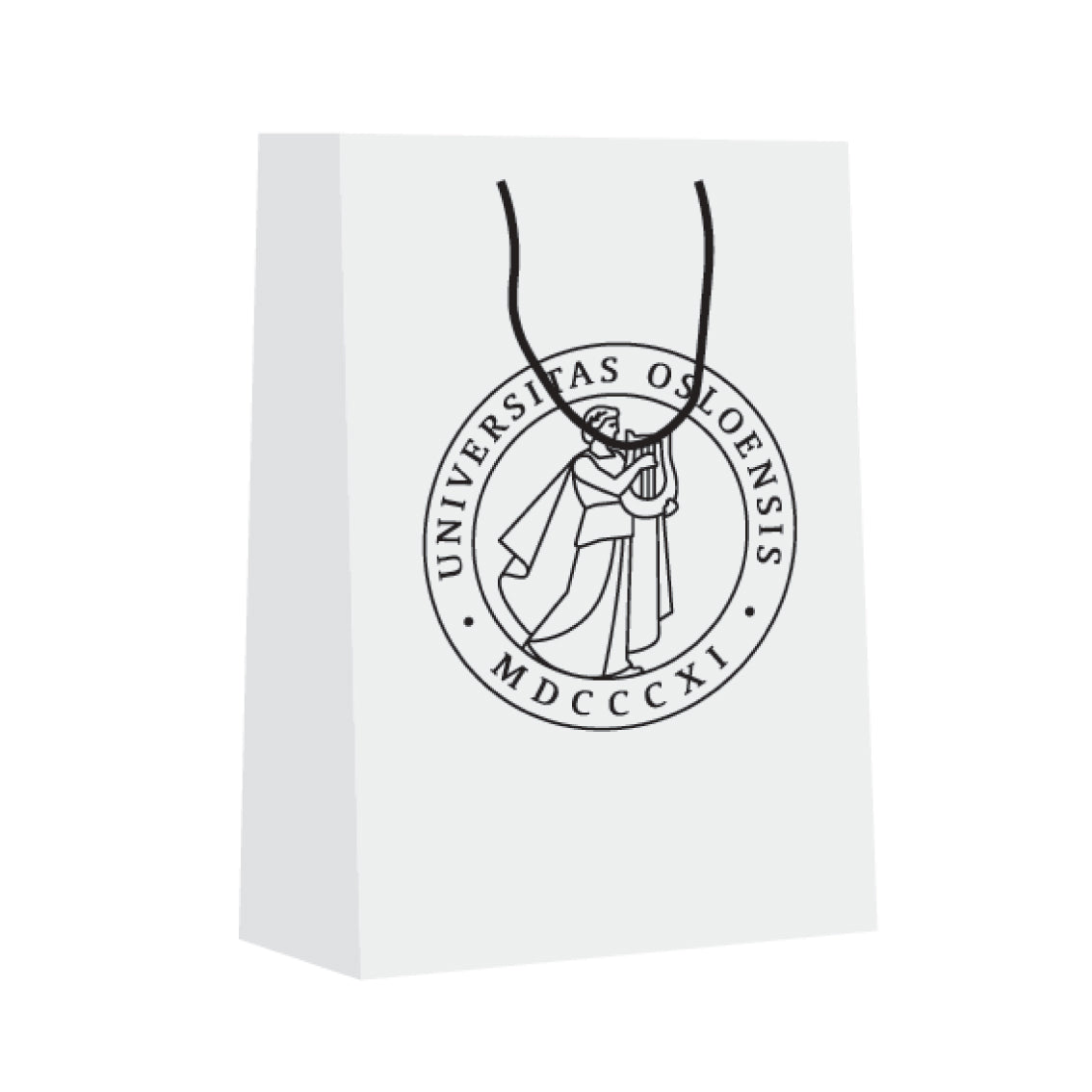 Pen gavepose i glanset, tykt papir, med UiO-logo på begge sider. 24 x 9 x 32 cm.