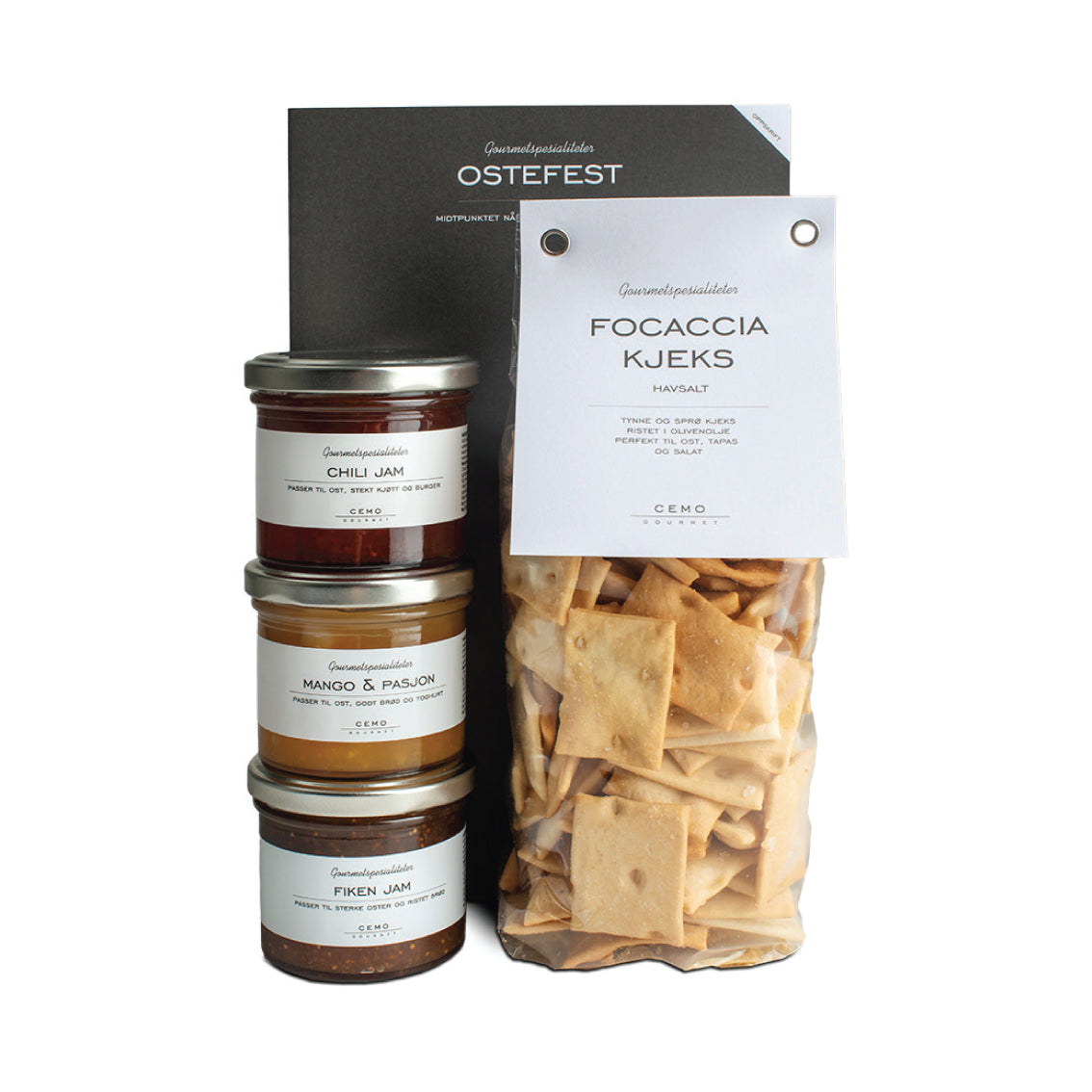 Ost og kjeks med litt god drikke til slår aldri feil, og her har vi samlet tre nydelige syltetøy sammen med den sprø gode focaccia-kjeksen vår. Syltetøyene er produsert i Norge.