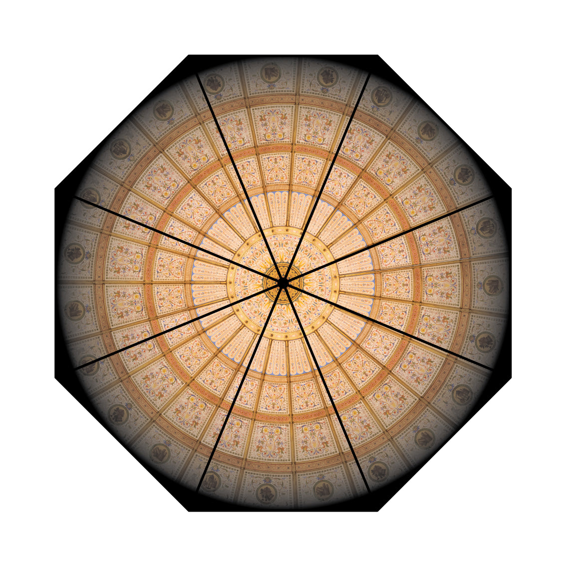 Trykk: Bilde av Gamle festsal inni paraplyen, svart utside med trykket UiO-logo på ett panel.